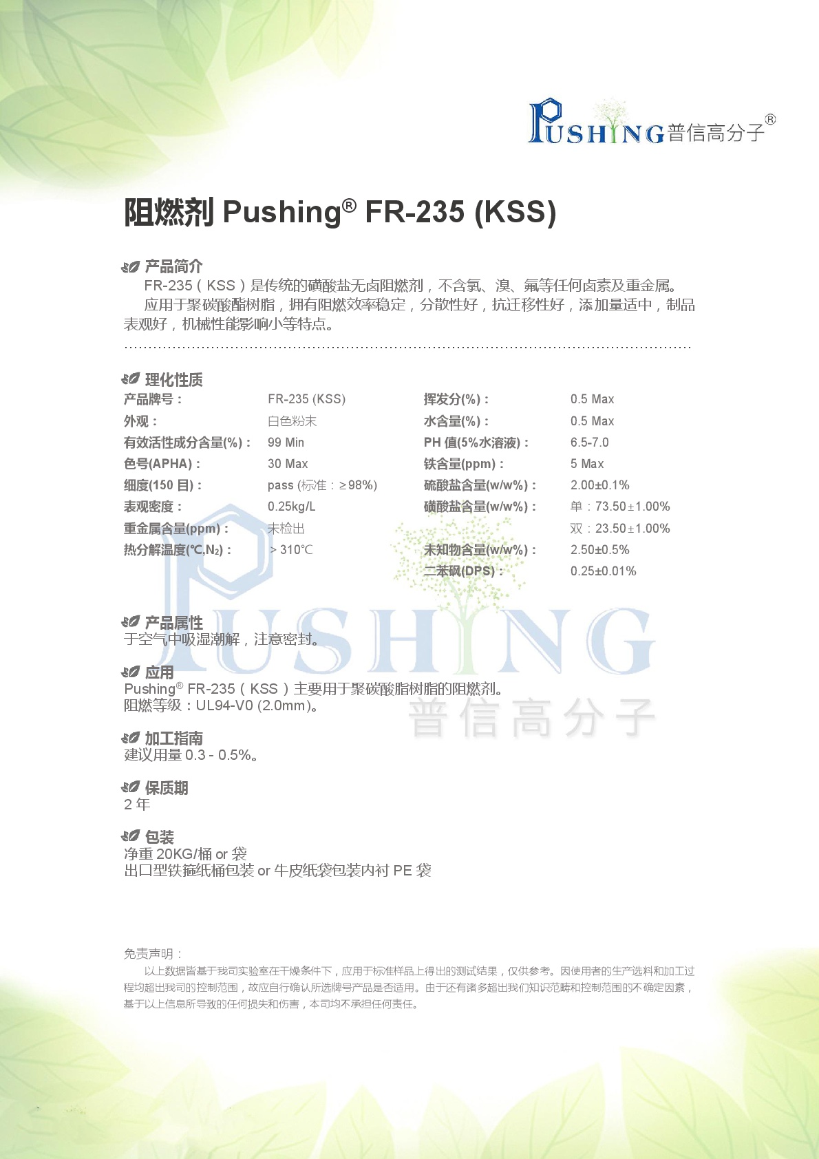 環(huán)保無鹵阻燃劑 阻燃等級(jí):UL94-V0 (1.6mm) 外觀:白色粉末 色度(Pt-Co):25# 表觀密度:0.25kg/L 水含量(%):0.15~0.37% 熱分解溫度(℃,N2):>310℃ 硫酸鹽含量(w/w%):2.00±0.1% 磺酸鹽含量(w/w%):?jiǎn)?73.5±1.0% 雙:23.5±1.0% 二苯砜(DPS):0.25±0.01% 發(fā)送郵件 點(diǎn)擊詢價(jià) 產(chǎn)品描述 相關(guān)產(chǎn)品